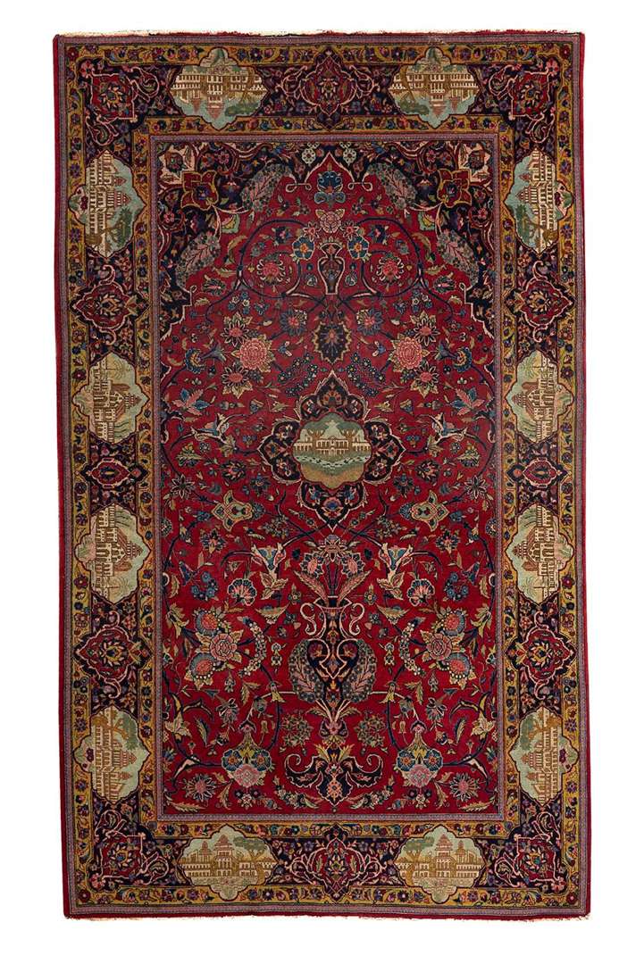 Velours de laine Kork d'agneau soyeuse de qualité sur fondations en coton. Champ rouge rubis à vase à bouquet floral polychrome encadrant un médaillon central floral.