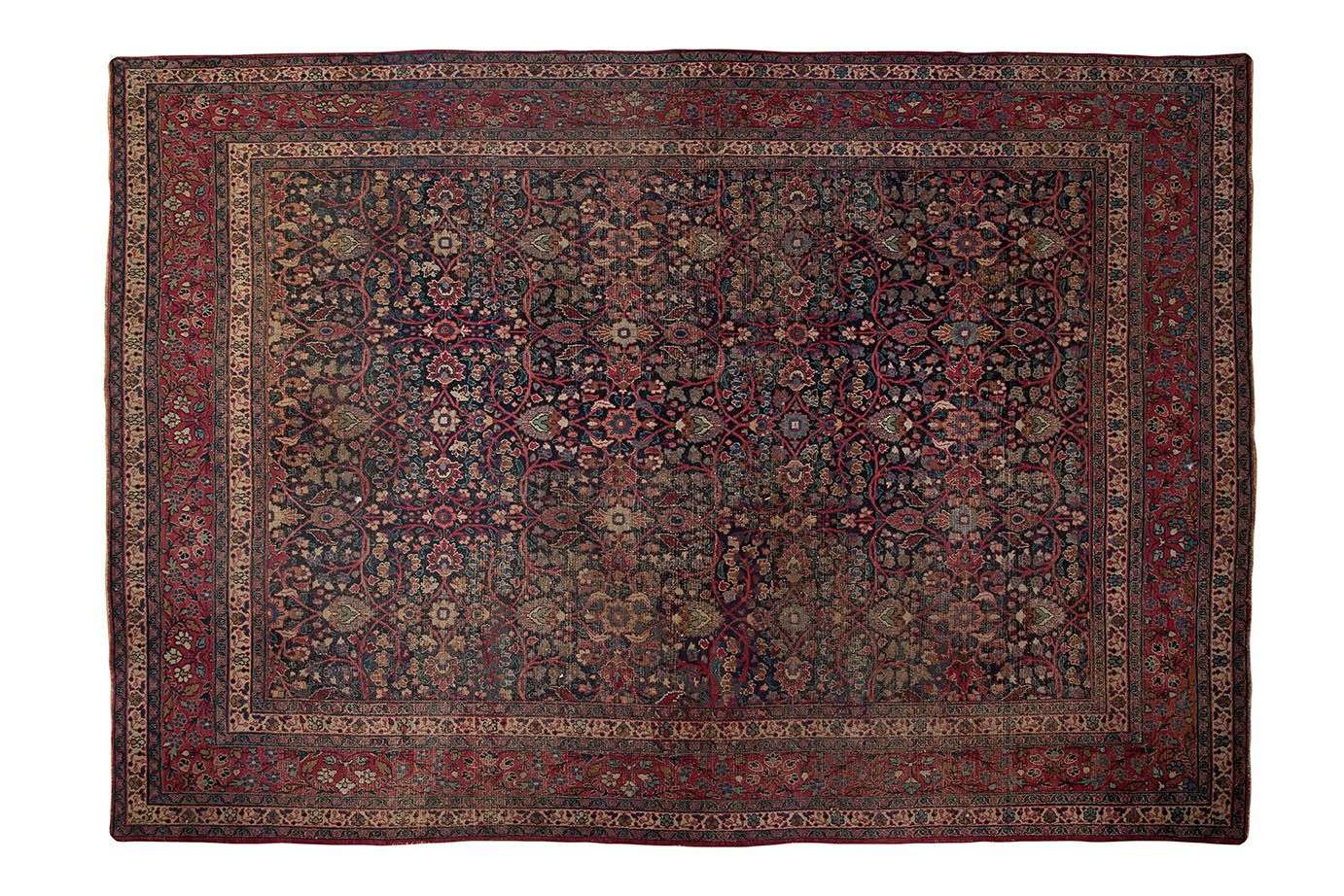 Velours de laine sur fondations en laine. Champ bleu nuit à décor dit Herati, à mosaïque de bouquets de fleurs en forme de diamants stylisés en polychromie.