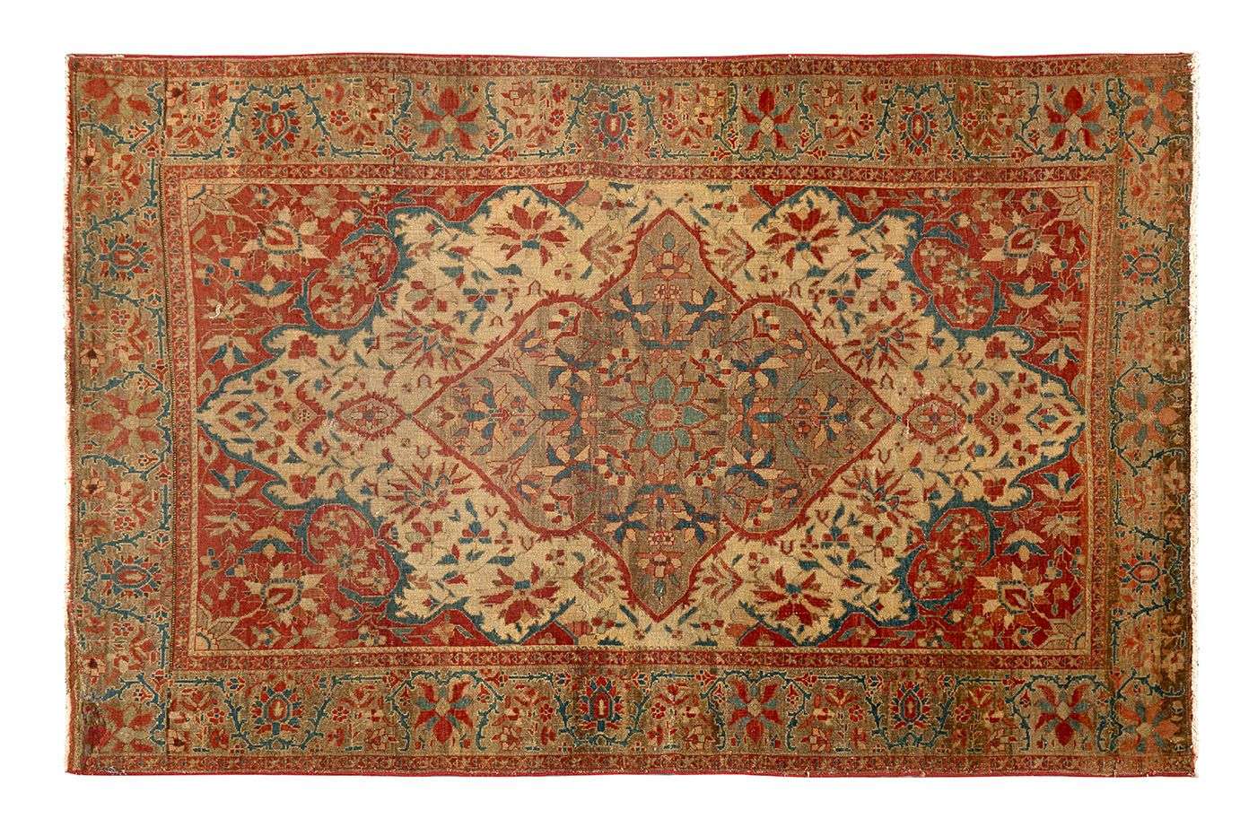 Velours de laine soyeuse sur fondations en coton. Champ beige à décor d'un large médaillon central floral cruciforme étoilé. Quatre écoinçons rouge brique à guirlandes fleuries polychromes. Triple bordure.