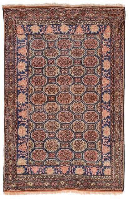 Champ vieux rose à décor de rangées de guhls stylisés formant une mosaïque et carrelage de bulbes floraux rappelant les tapis Yomoud boukhara. Triple bordure dont la principale à tarentules stylisées géométriquement.
