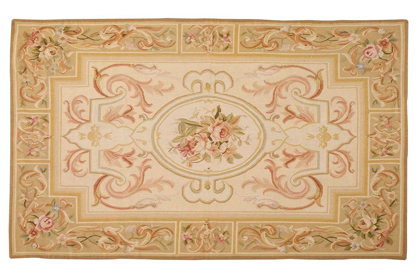 Aux fils de laine sur fondations en coton. Champ beige à décor d'un médaillon central ovale incrusté d'un bouquet de fleurs et feuillages polychromes.