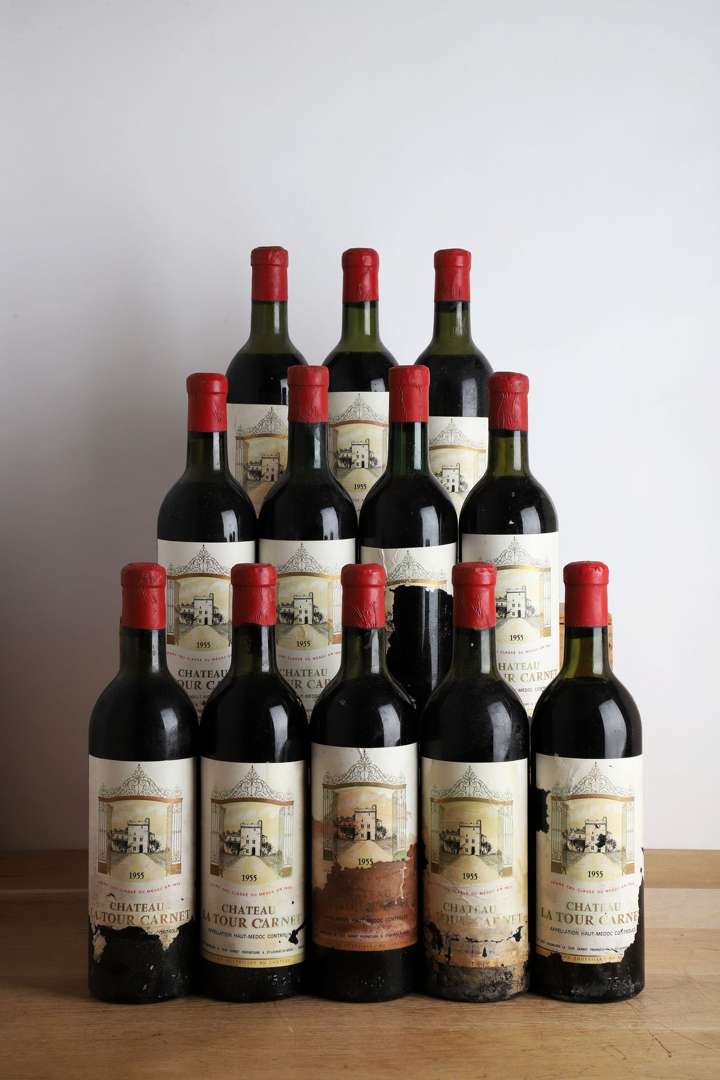 12 B CHÂTEAU LA TOUR CARNET (Caisse Bois d'origine sans pavillon supérieur) (3 T.L.B| 5 H.E.+ et 4 H.E| e.t.a.) - 1955 - GCC4 Haut-Médoc