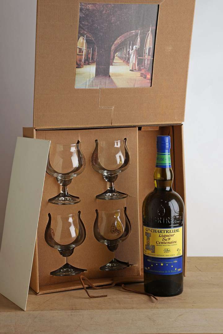 1 B CHARTREUSE LIQUEUR DU 9ÈME CENTENAIRE PÉRIODE 2001-2004 70 cl 47% (Coffret avec 4 verres dégustation) - NM - Pères Chartreux