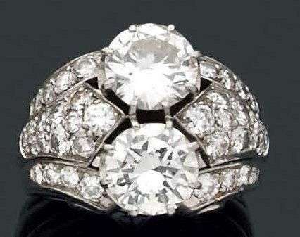 Bague en platine sertie de deux diamants de taille moderne épaulés de deux motifs à enroulement sertis de brillants. Vers 1940 Tour de doigt: 55 - Poids brut: 16 gr
