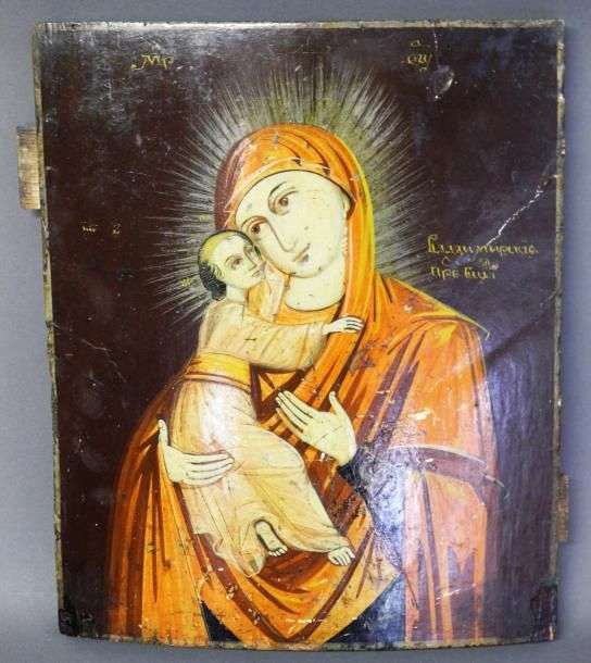 Icône de la Vierge de Wladimir. Vierge du type Eleousa (de tendresse), dont l'originale serait due à l'évangéliste Saint Luc. C'est l'icône protectrice de la Russie. Représentation éloignée des modèles classiques russes. Certainement originaire des Balkans: Moldavie, Roumanie... XIXe s. Des manques et égratignures, restaurations. 28,5 x 24 cm