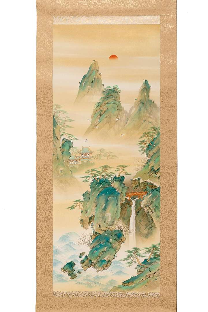 Rouleau vertical à l'encre et couleurs sur soie figurant le mont Horai, séjour des immortels.