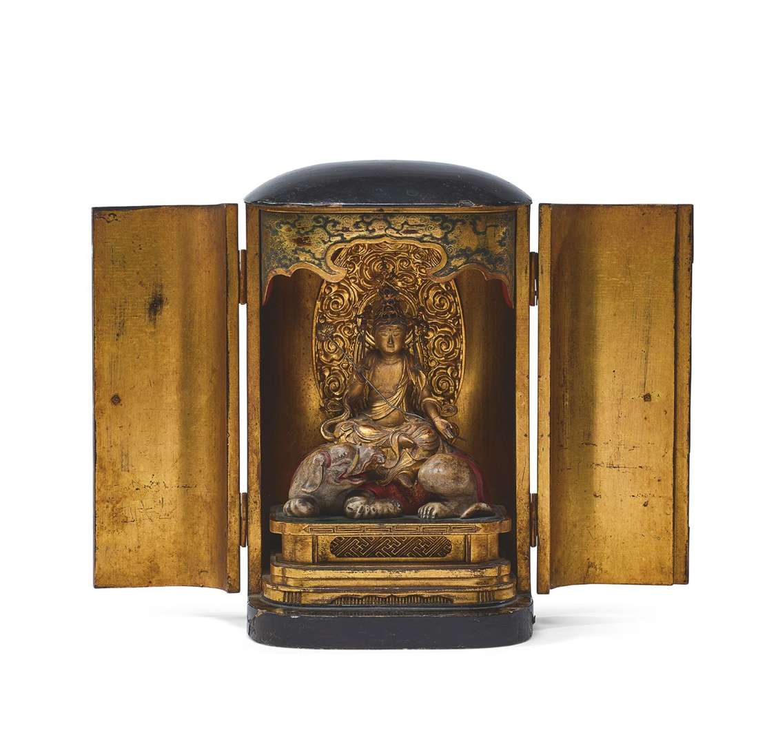 Chapelle portative (zushi) en bois laqué noir et or abritant une statue de Fugen
