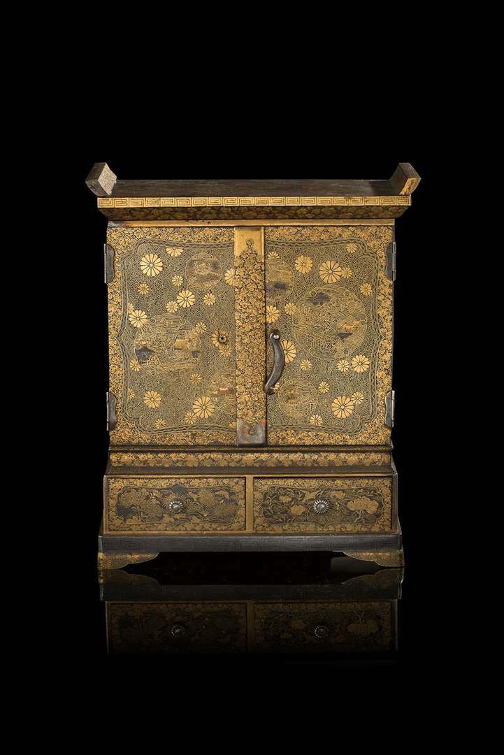 La façade à deux tiroirs et deux portes ouvrant sur plusieurs tiroirs et compartiments asymétriques. L'intérieur des portes ornées de vues du Kiyomizu-dera et du Kyoto-gosho.