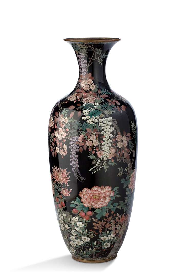 Important vase en bronze doré et émaux cloisonnés décoré de fleurs variées (glycine, cerisier, pivoines, chrysanthèmes...) se détachant sur un fond noir.