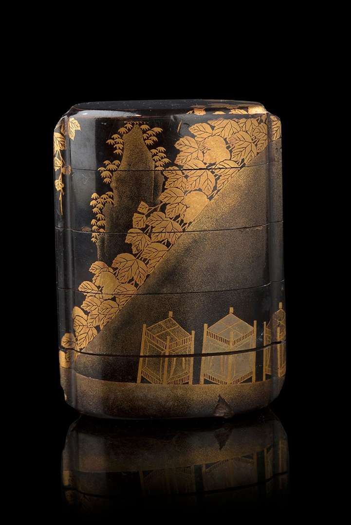 Inro à quatre cases en laque hiramaki-e d'or et argent sur fond ro-iro décoré de lanternes et d'une colline bordée de lierre avec une cascade en arrière-plan. L'intérieur en laque nashiji.