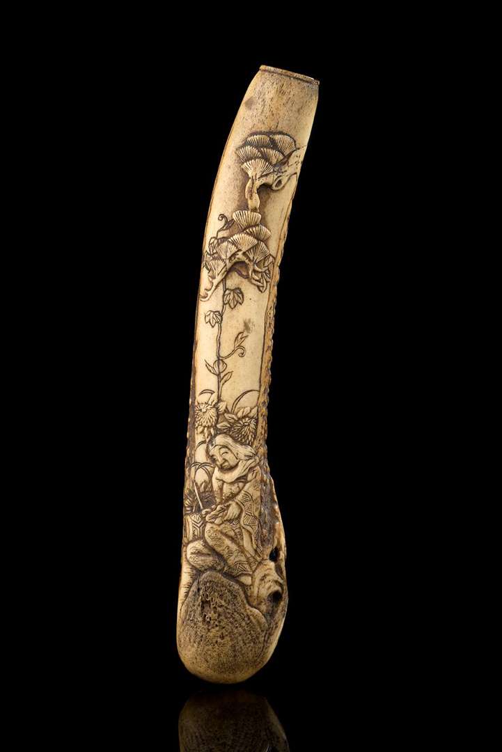 Kiseru-zutsu de type otoshi-zutsu en bois de cerf sculpté décoré d'une femme écrivant sous un grand pin. Pipe (rau-kiseru) en bambou et métal argenté.