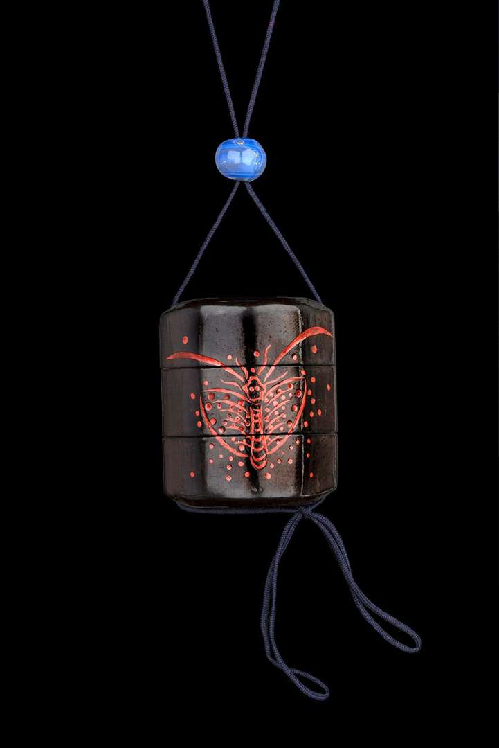Inro à deux cases en bois laqué noir, décoré d'un papillon en laque rouge. Ojime en verre bleu. Netsuke en bois sculpté polychromé figurant un shojo tenant un éventail.