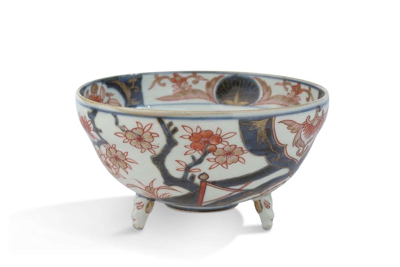 Bol tripode en porcelaine Imari à décor de cerisiers en fleurs et réserves polylobées.
