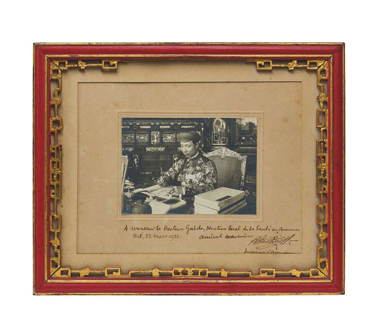Dinh dans son cabinet de travail dans un encadrement en bois laqué rouge et or, avec un envoi manuscrit de l'empereur pour le Dr Gaide « A Monsieur le Docteur Gaide, directeur local de la santé en Annam, Hué 22 Mars 1921, Amical Souvenir, Khai Dinh
