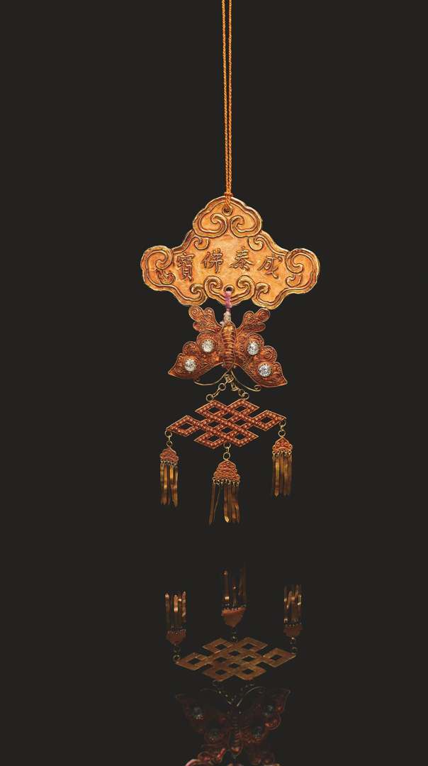 Kim Khanh en or 18k repoussé et ciselé, orné de volutes et nuées, avec une formule laudative en quatre caractères sur une face « Than Thai Phat Bu », l'autre face avec le mantra bouddhique « An ma ni bat me hong » (Om mani padme hum). Cordon de suspension, pendeloque en forme de papillon travaillé en filigrane et incrustations de pierres du Rhin et pendeloque en forme de noeud infini.