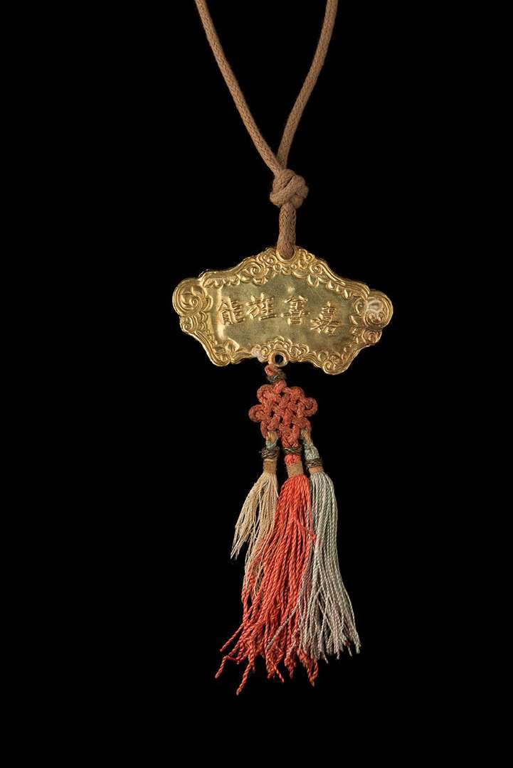 Kim Khanh de classe moyenne en or 18k, avec les inscriptions GIA THIEN SANH NANG (« Honorer la vertu, signaler par une marque d'honneur la compétence »), et sur l'autre face DONG KHANH SAC TU (« Décerné par l'empereur Dong Khánh »). Cordon de suspension brun et pampilles de soie jaune, orange et vert.