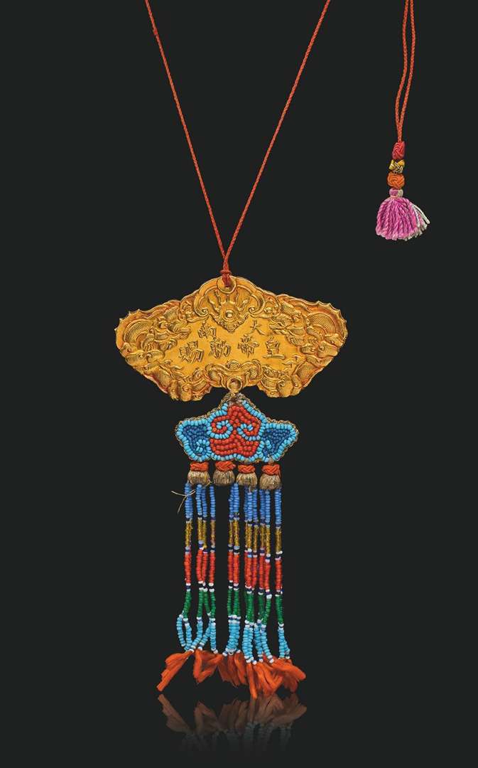 Khanh de première classe »). Cordon de suspension et pampilles de perles de verre multicolores.