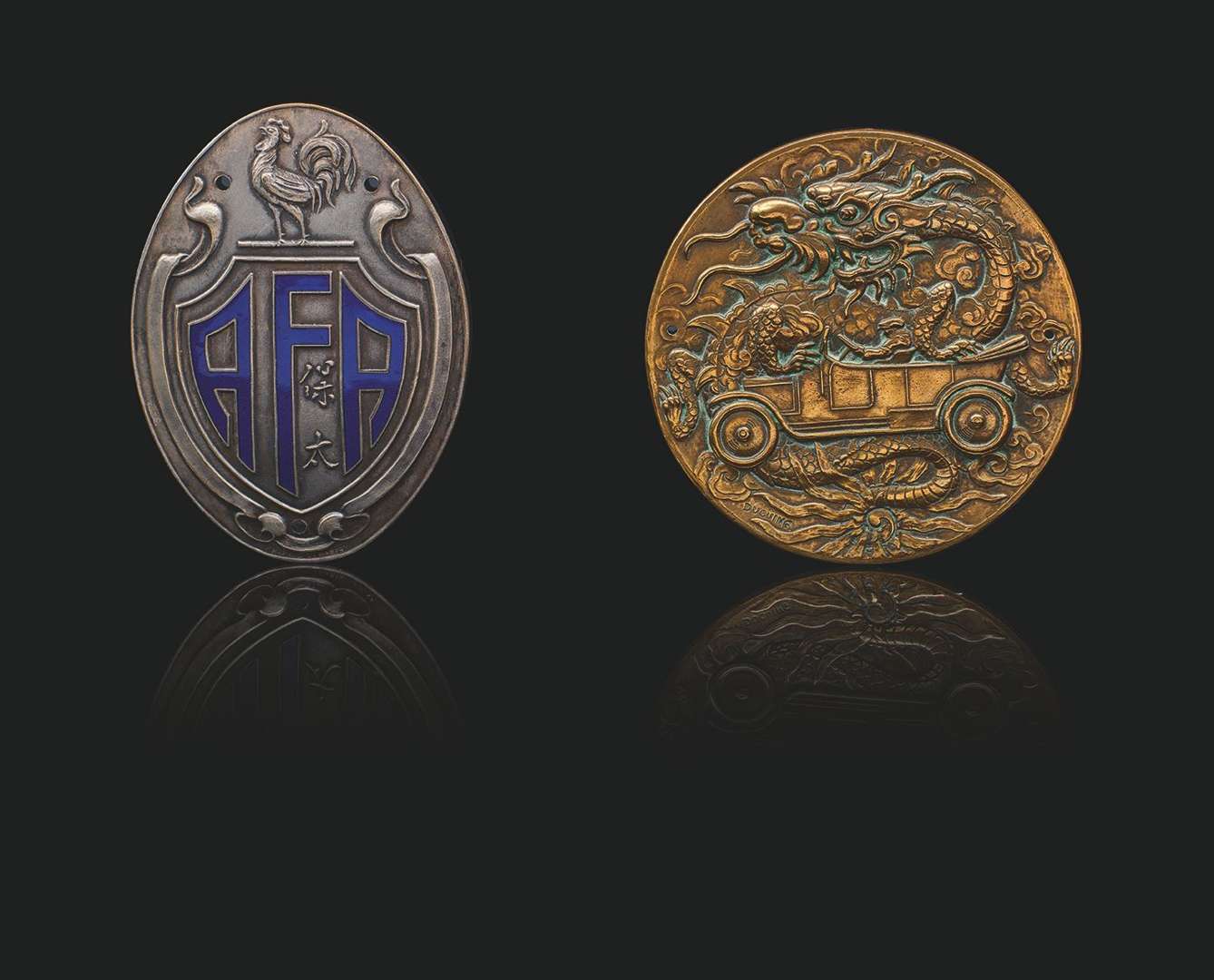 Une plaque en métal décorée d'un automobiliste et d'un dragon, d'après un modèle du sculpteur Paul Ducuing (1867 - 1949), et une plaque ovale en métal argenté et émail, décorée d'un écu avec les initiales AFA. Signée « PH Fess. Paris ».