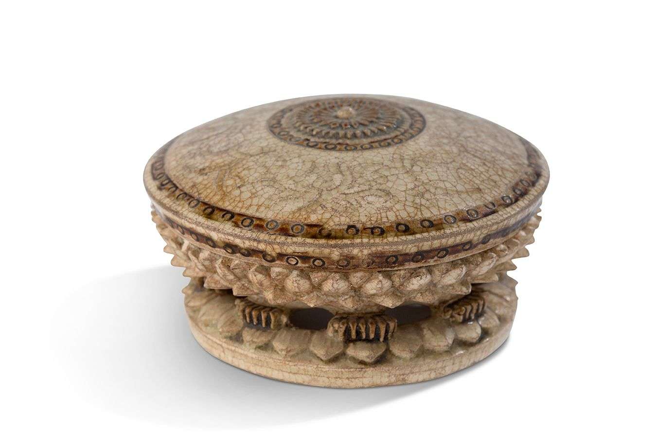Le couvercle légèrement bombé, décoré de deux frises de petits cercles, et d'une fleurette à multiples pétales rehaussé à l'oxyde de fer.