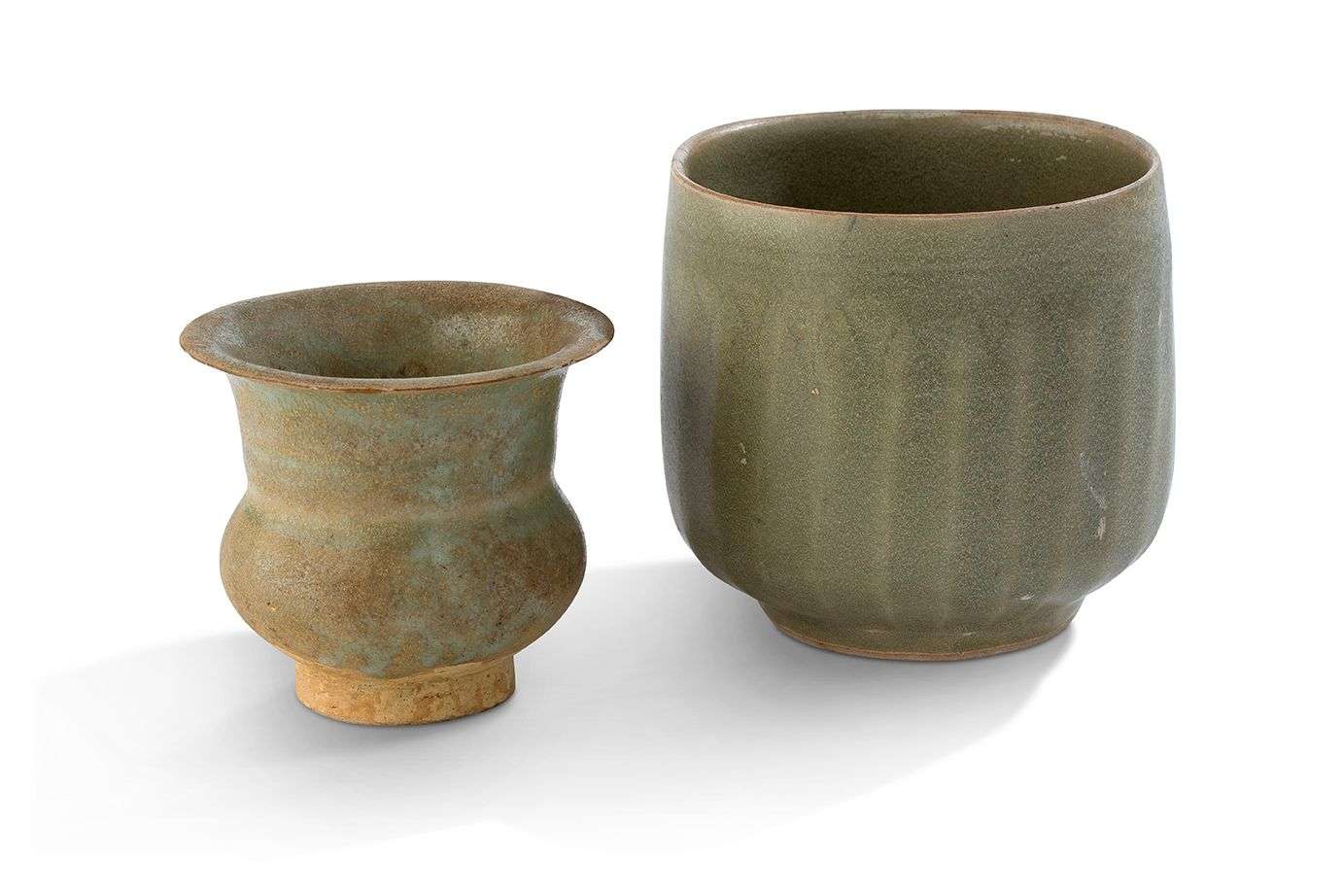Ensemble comprenant un bol haut et un crachoir en grès à couverte céladon.H. 11,3 cm et 8,8 cm