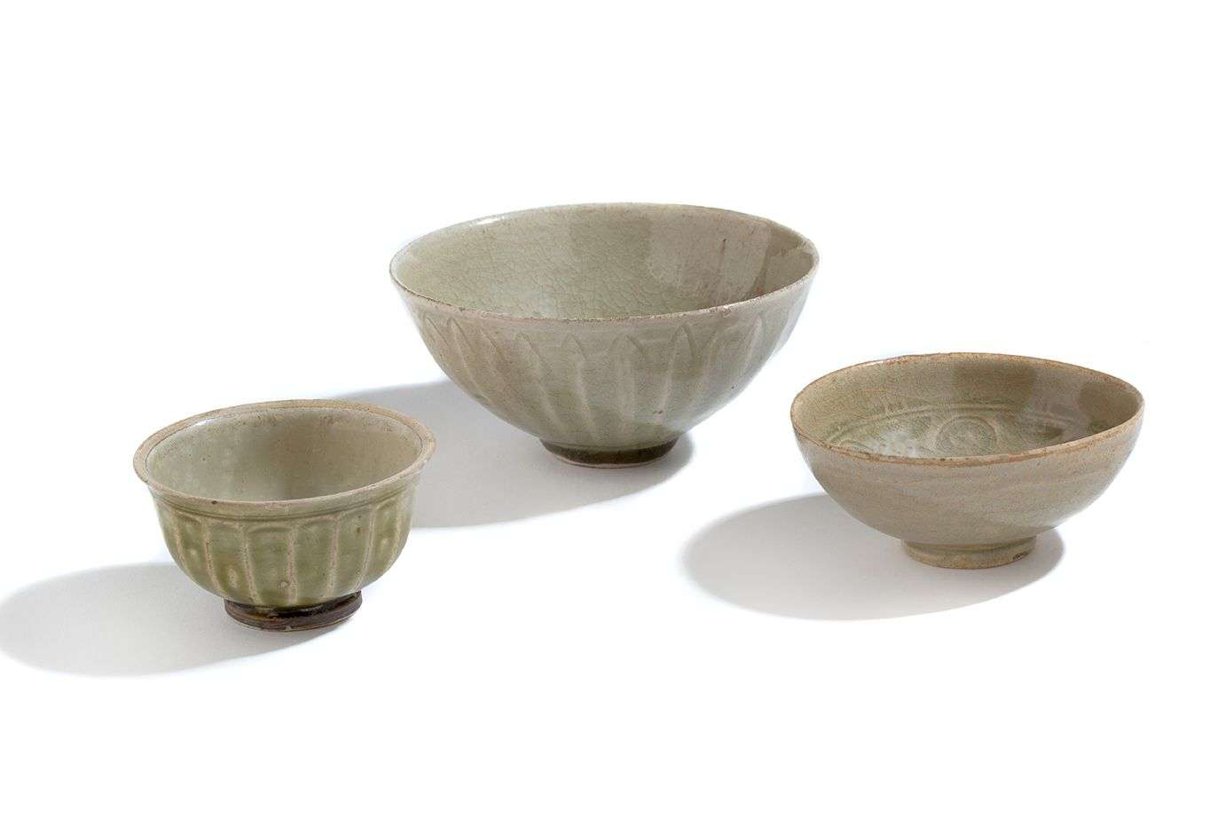 Ensemble comprenant trois bols en grès à couverte céladon, deux avec l'extérieur imitant des pétales, l'un avec l'intérieur estampé.