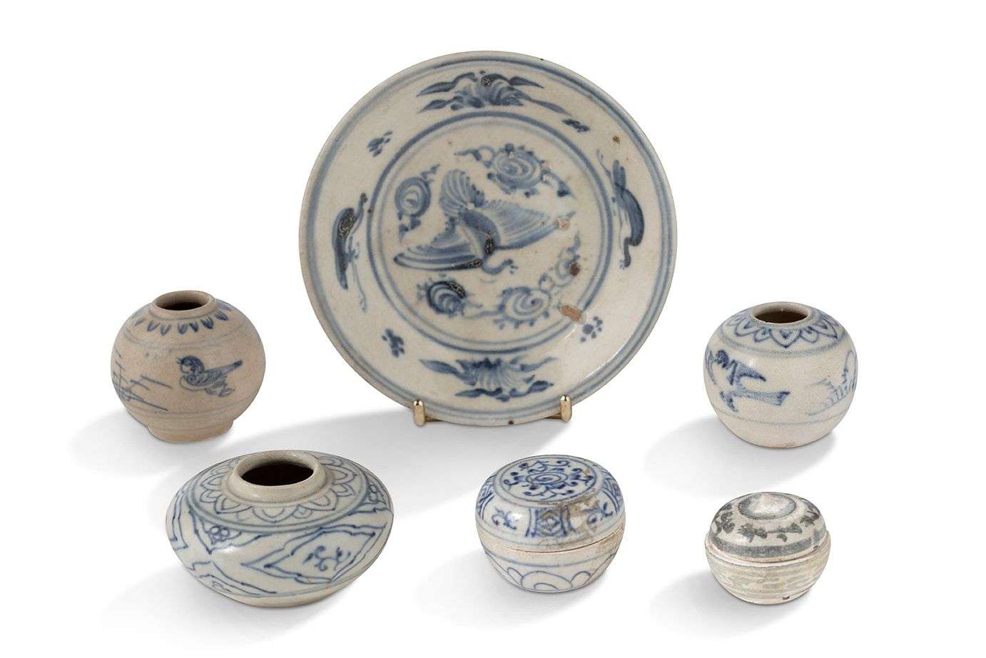 Ensemble de trois petites jarres, deux petites boîtes et un plat en grès bleu-blanc.