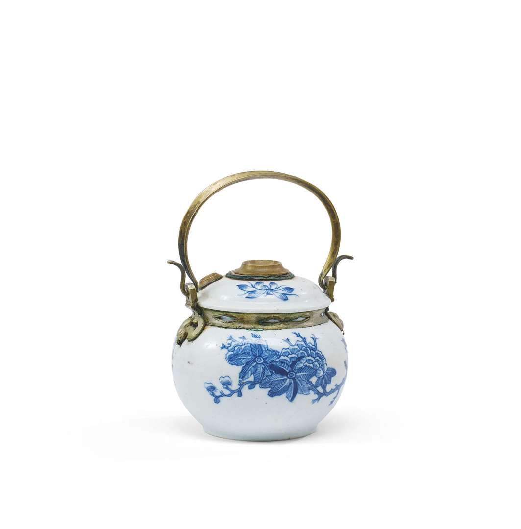 Pipe à eau en porcelaine bleu-blanc à décor de pivoines et fleurs variées. La monture en paktong à décor de chauve-souris.