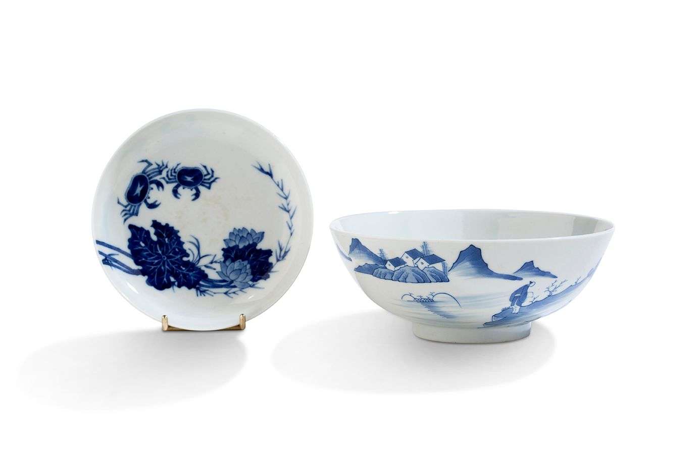 Ensemble en porcelaine bleu-blanc comportant un bol à décor de paysage lacustre, la base avec une marque Tu Duc, et un petit plat à décor de crabes et lotus, la base avec une marque Noi Phu Thi Nam.