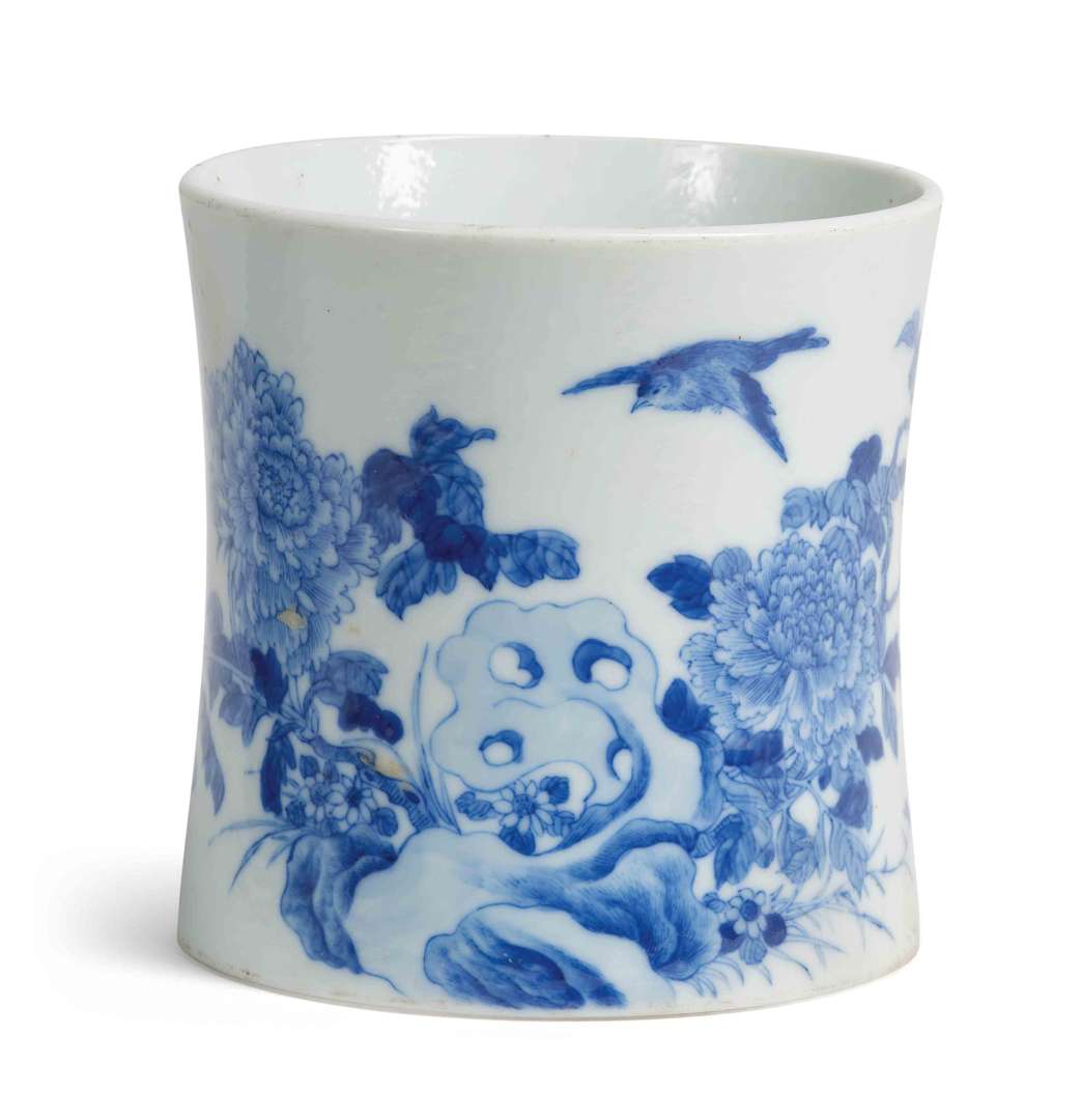 Porte-pinceaux bitong en porcelaine bleu-blanc décoré d'oiseaux et papillons parmi les fleurs. La base avec une marque