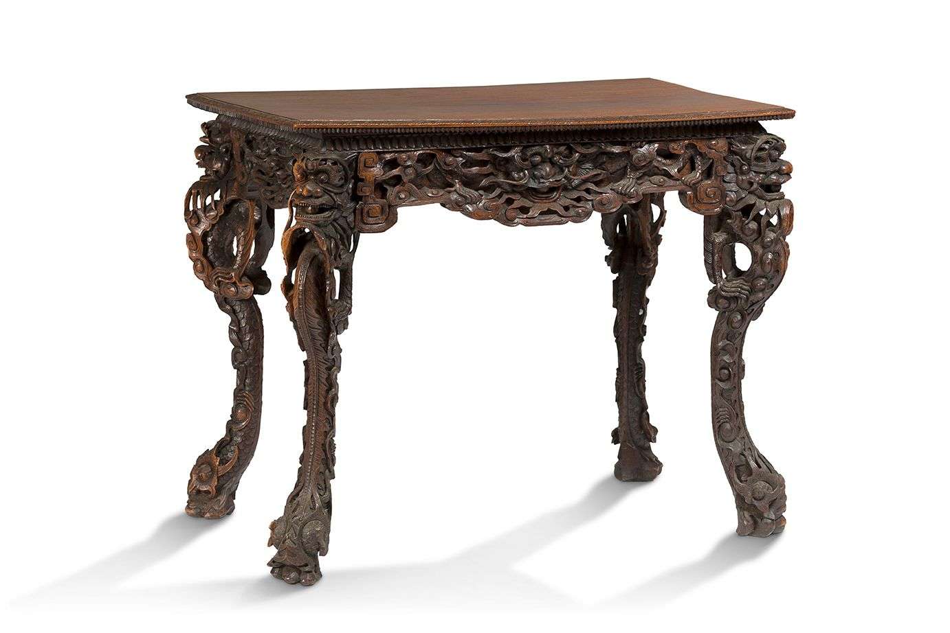 Console en bois naturel sculptée à décor de dragons parmi les nuées, reposant sur quatre pieds arqués imitant les corps de créatures dont les têtes forment les angles du tablier. Le plateau postérieur.