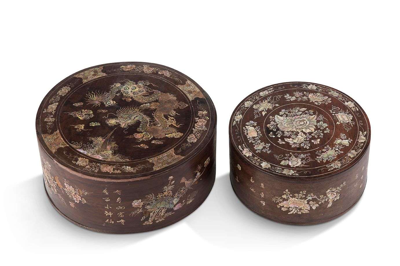 Deux boîtes rondes en bois et incrustations de nacre, avec un plateau amovible compartimenté à l'intérieur. L'une décorée de fleurs des quatre saisons et poèmes, l'autre ornée d'un dragon crachant de l'eau, carpes-dragons bondissantes et fleurs des quatre saisons.