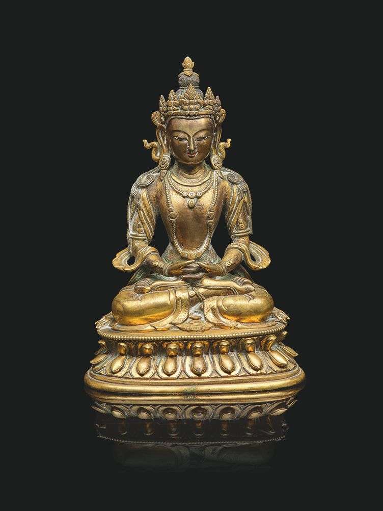 Statue d'Amitayus en bronze doré. Le bouddha assis en vajrasana sur une double base lotiforme, les mains reposant en dhyanamudra sur les jambes, vêtu d'un dhoti et d'écharpes retombant élégamment, paré de nombreux bijoux, le front ceint d'une couronne à cinq fleurons. L'expression sereine et bienveillante. La base non scellée.
