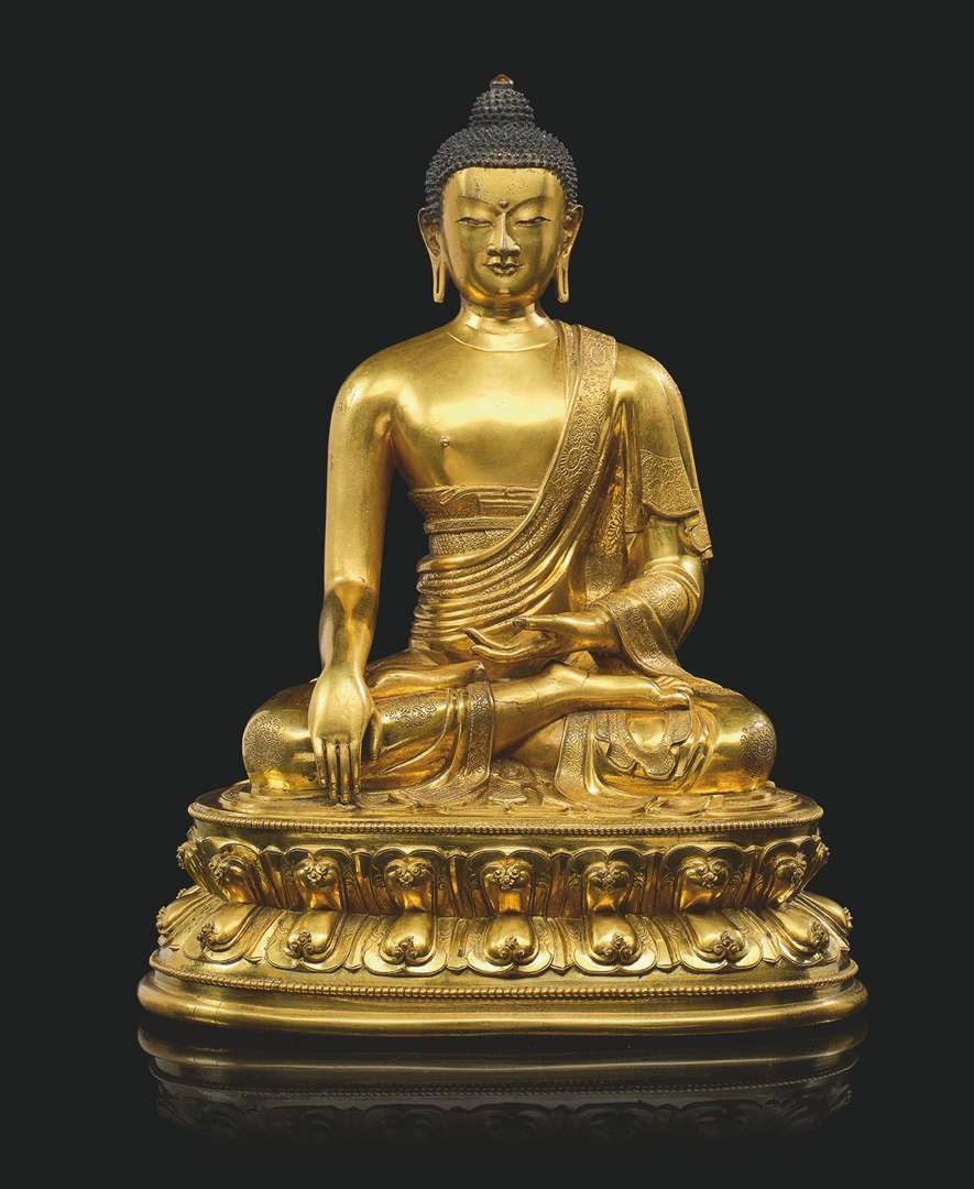 Statue de Shakyamuni en bronze doré, le Bouddha assis en vajrasana sur une double base lotiforme aux pétales richement ouvragés, sa main droite en bhumiparshamudra, la main gauche reposant en dhyanamudra sur les jambes.