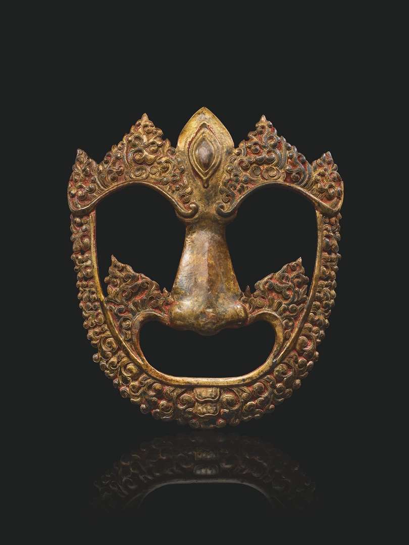 NOTE Les masques de ce type étaient portés par des lamas de la secte Gelugpa, fixés sur leurs coiffes, lors des danses rituelles d'offrande au cours des initiations de Kalachakra.