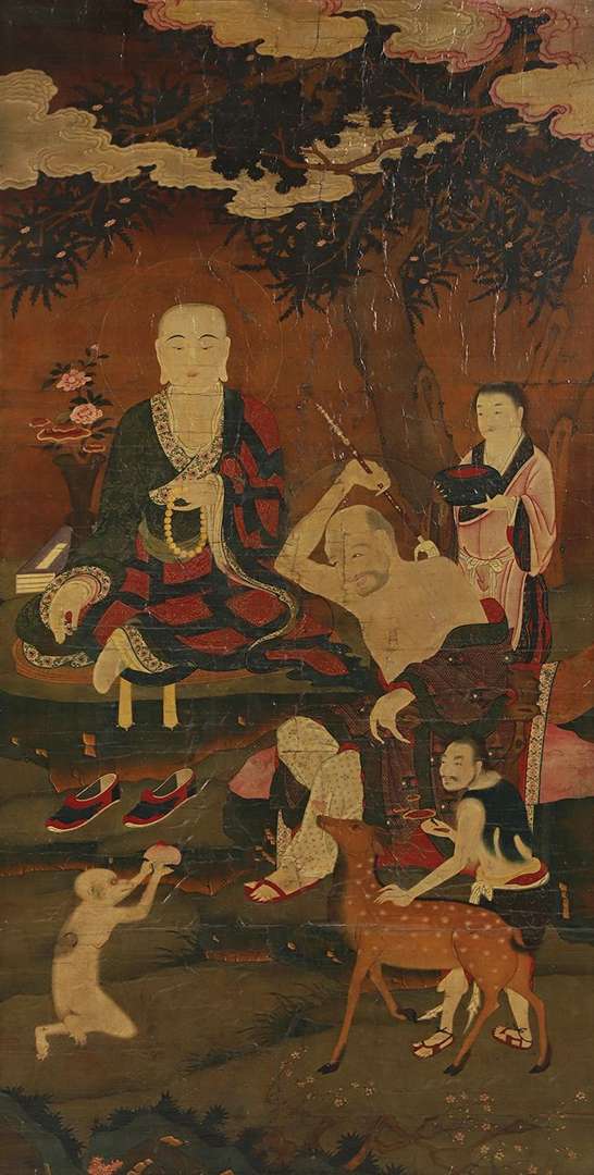 Il est accompagné d'un attendant tenant un bol à aumônes. Le second, âgé, à l'expression rieuse, est assis en bhadrasana sur un siège, se grattant le dos avec un bâton ouvragé se terminant par une main sculptée. Il est richement vêtu, à la mode étrangère, d'un pantalon et d'un long manteau découvrant largement son torse et son dos. Il est accompagné d'un attendant vêtu lui tendant un champignon lingzhi et d'un daim, tandis qu'à ses pieds un singe au pelage blanc lui présente une pêche d'immortalité. La scène prend place dans un paysage rocheux, à l'ombre d'un grand arbre dont le feuillage dentelé se mêle à d'élégantes nuées pastel. Deux sceaux Minzhong Si Changzhu Ji (« Marque des moines du temple du Deuil des preux loyaux »), l'un en partie supérieure droite, l'autre en partie inférieure gauche. Marouflée sur un panneau en bois et dans un encadrement postérieur.
