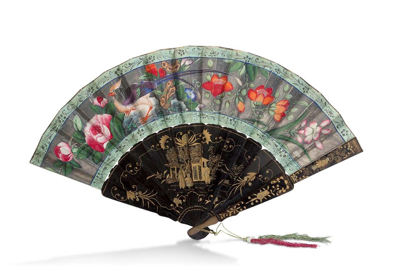 Éventail à dix-huit brins en laque noir et or et papier gouaché. La feuille à décor double face de dignitaires et dames de cour dans des palais et jardins, les visages minutieusement peints et les vêtements avec des applications de tissu. Le revers orné d'un oiseau parmi les fleurs. Pampilles en fils de soie bicolores. Dans une boîte en carton et velours.