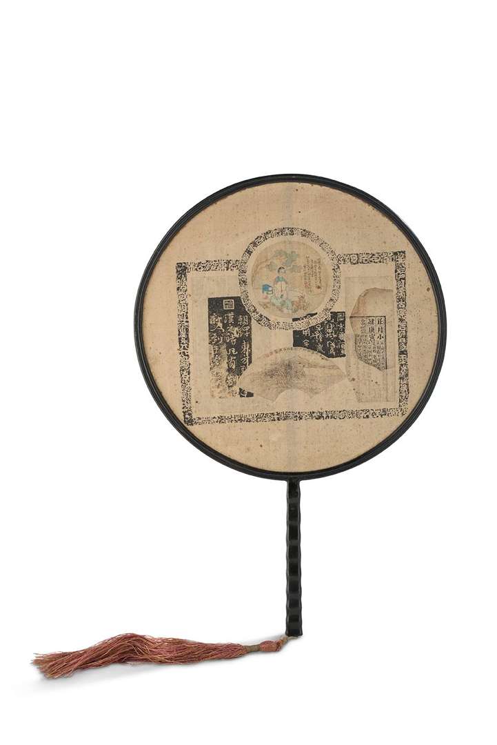 Ensemble de deux éventails tuanshan circulaires. L'un avec une face en vannerie et une réserve avec un paysage lacustre, le revers décoré à l'encre et couleurs sur soie de papillons parmi les fleurs. L'autre avec une face ornée à l'encre et couleurs sur soie de réserves de formes variées imitant des estampages et des peintures, le revers avec une longue inscription à l'encre sur papier doré.