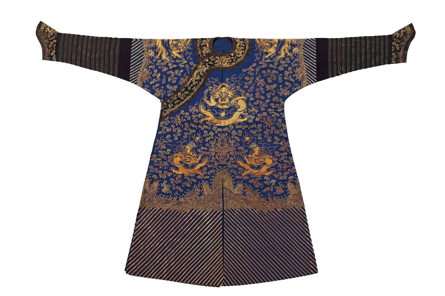 Robe de cour (longpao) bleue nuit brodée aux fils dorés de neuf dragons à cinq griffes pourchassant la perle parmi des nuages peuplés de paniers fleuris, chauve-souris et emblèmes des Huit Immortels taoïstes, au-dessus d'une bande de lishui surmontée de flots tumultueux d'où émergent les pics sacrés, des carpes, lotus et les Huit Emblèmes