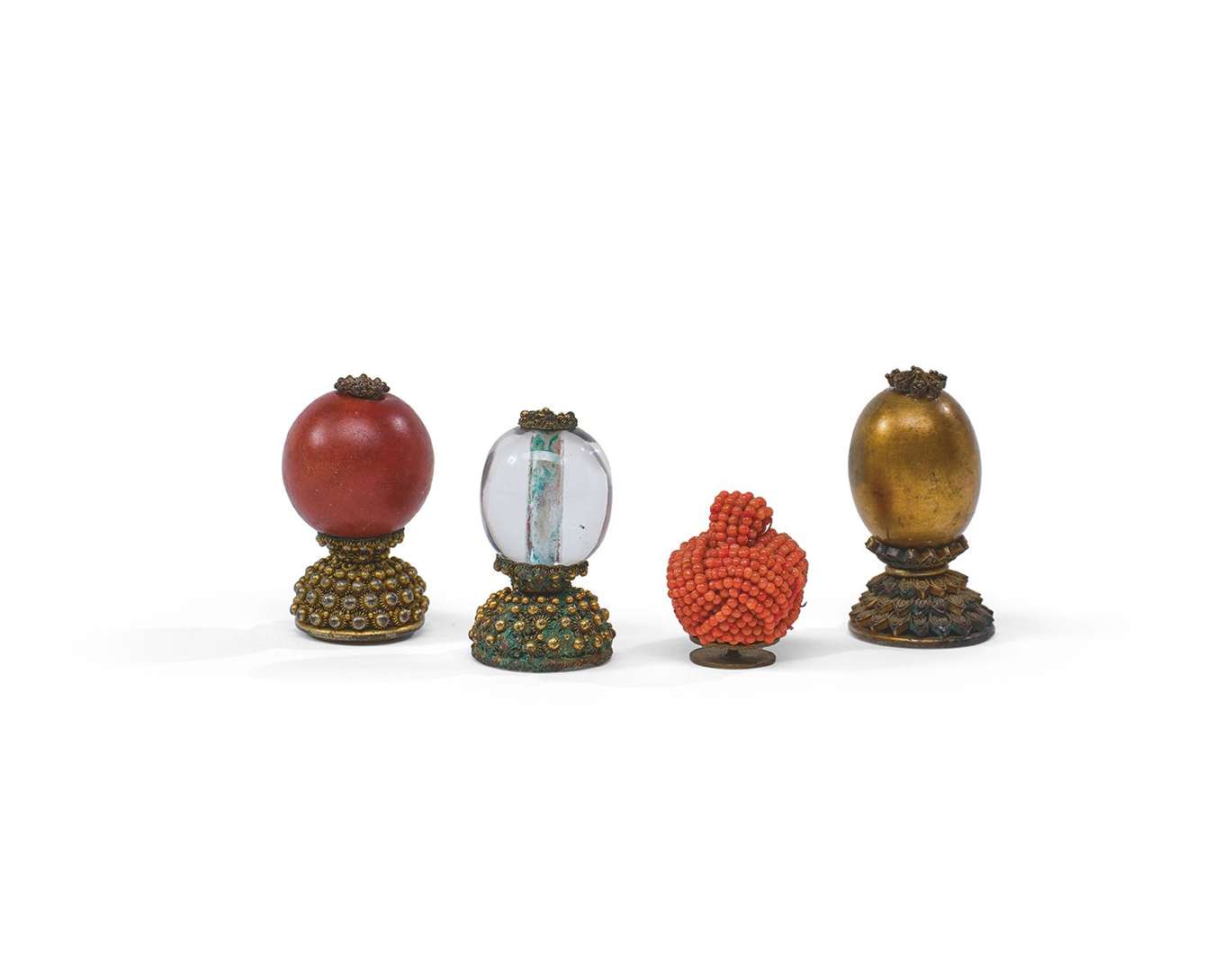 Matériaux (verre, bronze et perles de rocaille), tailles et couleurs variés.