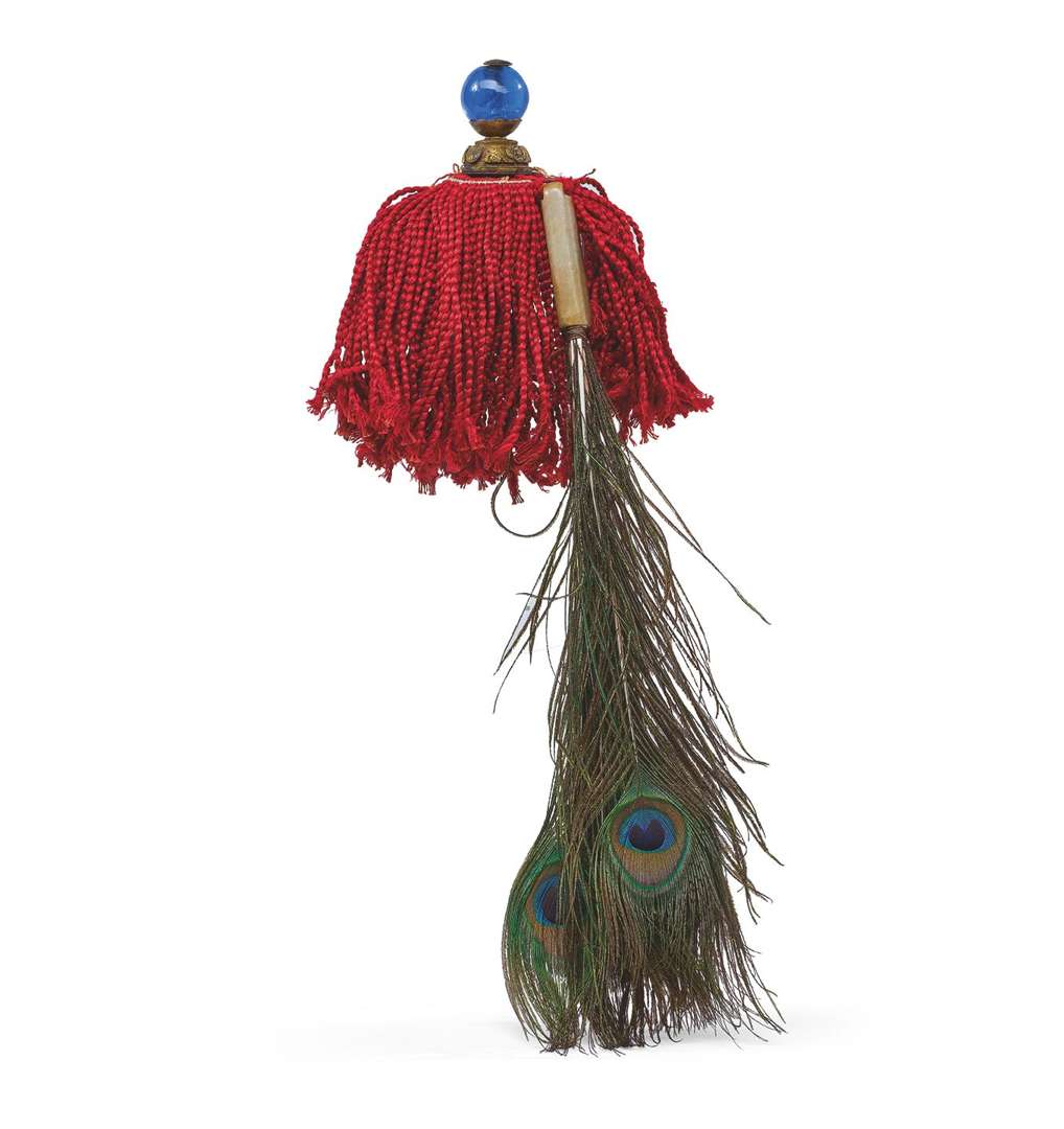 Bouton de chapeau de fonctionnaire de troisième rang en verre transparent bleu avec ses franges en soie rouge tressée pour chapeau de type nuanmao (« chapeau d'hiver »), avec un lingzhi en plumes de paon dans un tube en jade.