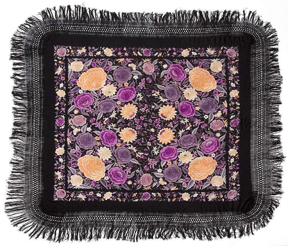 Important châle dit « de Manille » en soie noire densément brodé sur les deux faces de pivoines, pampres et fleurettes variées, et bordé de franges.