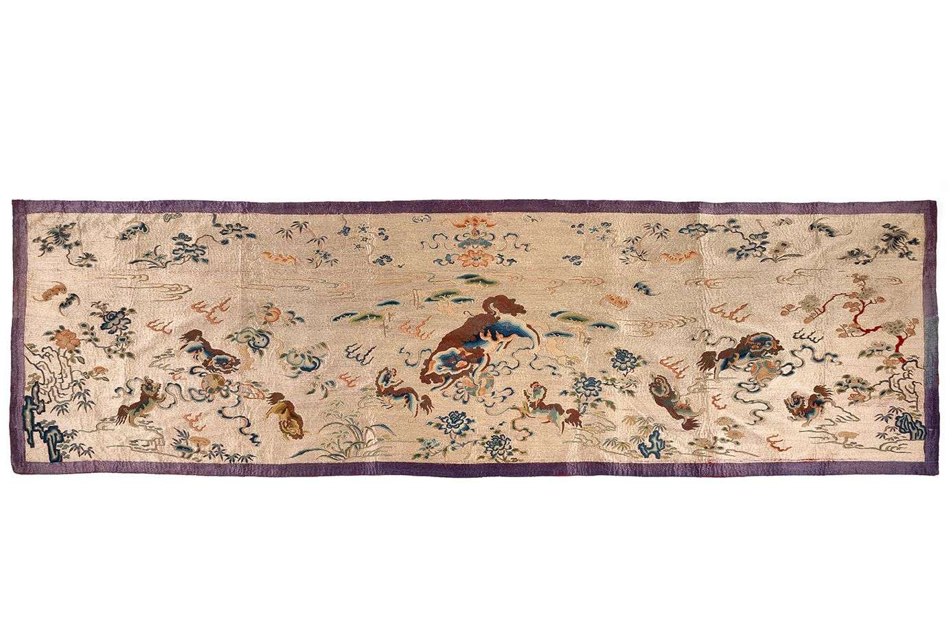 Importante tenture horizontale brodée aux fils de soie polychromes au point de Pékin de neuf lions bouddhiques jouant dans un paysage montagneux, parmi les prunus, pivoines, bambous, narcisses, pins, pêchers...