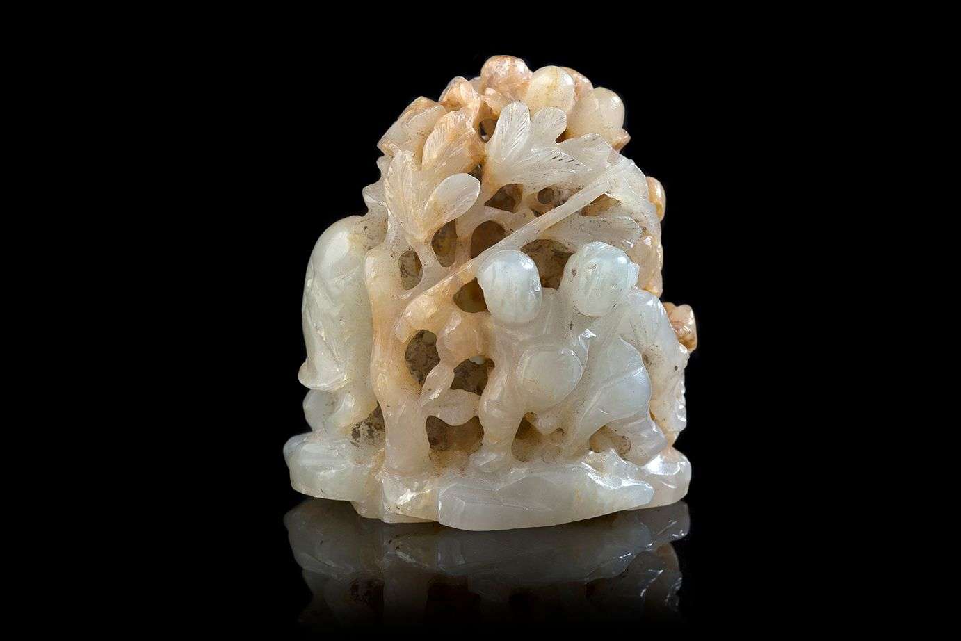 Ornement de coiffe en jade céladon pâle partiellement calcifié sculpté figurant des enfants jouant dans un bosquet.