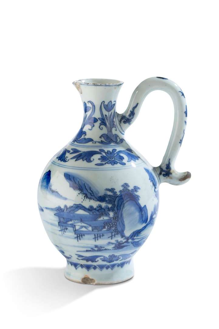 Verseuse en porcelaine bleu-blanc à décor de paysage lacustre, le col orné de tulipes feuillagées.