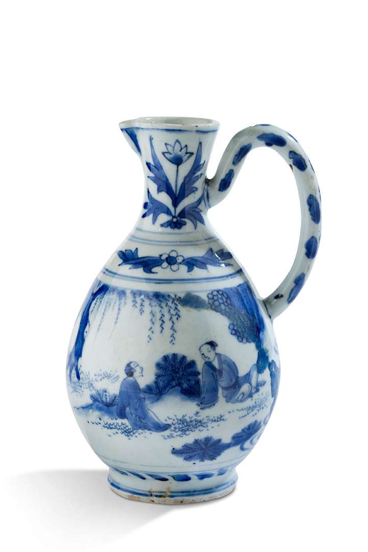 Verseuse en porcelaine bleu-blanc à décor de deux lettrés et leurs attendants dans un jardin, le col orné de tulipes feuillagées.