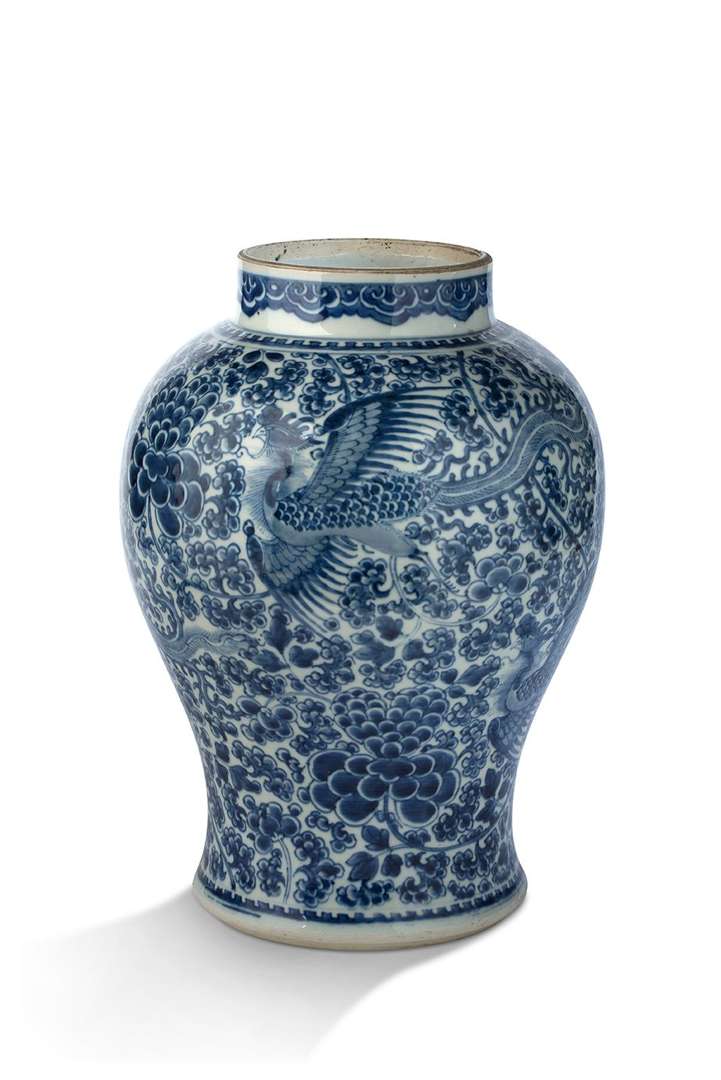 Paire de vases balustres en porcelaine bleu-blanc à décor de phénix parmi les pivoines et rinceaux feuillagés. La base avec un double cercle en bleu sous couverte.