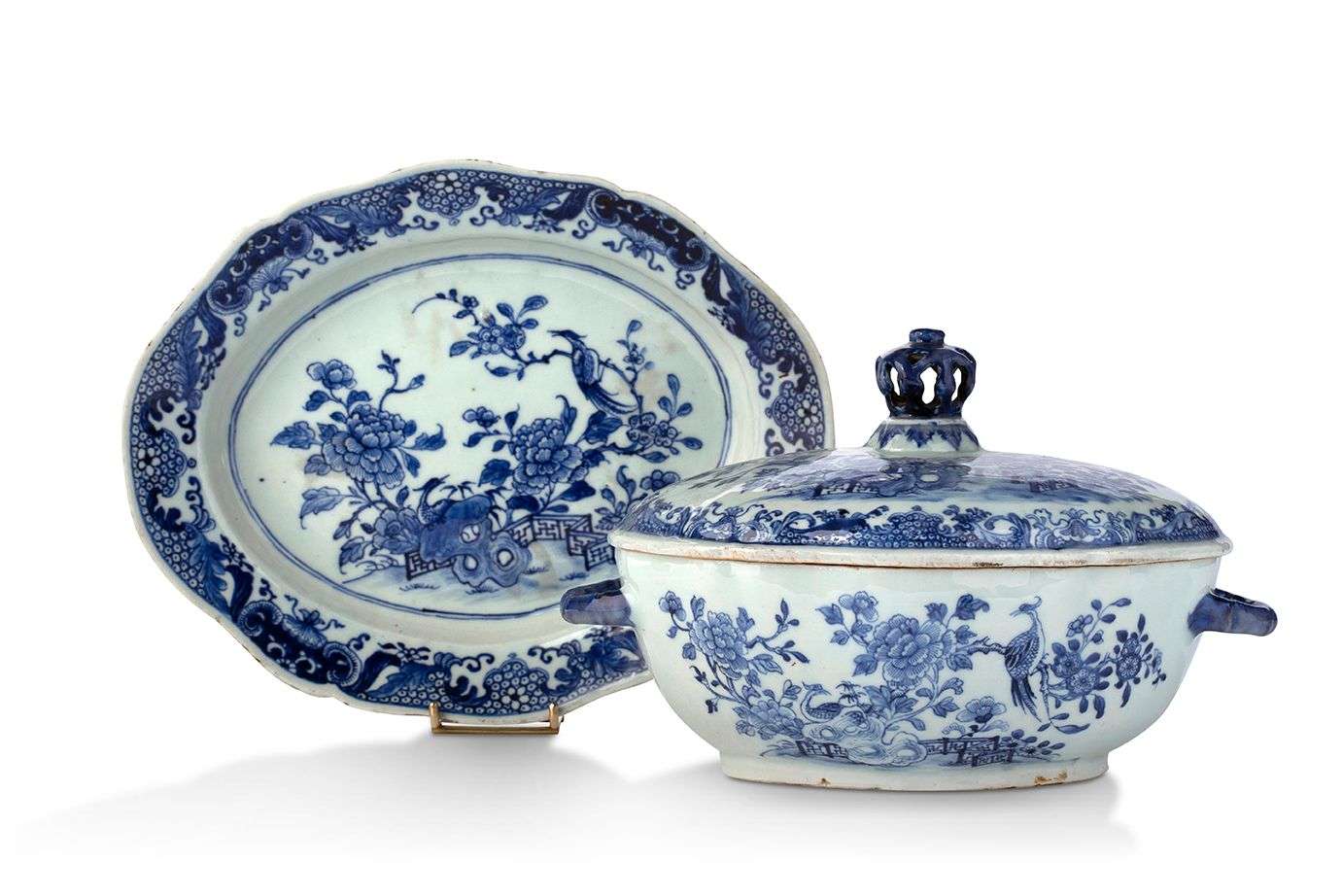 Terrine couverte et son plat de présentation chantourné en porcelaine bleu-blanc à décor d'oiseaux parmi les fleurs.