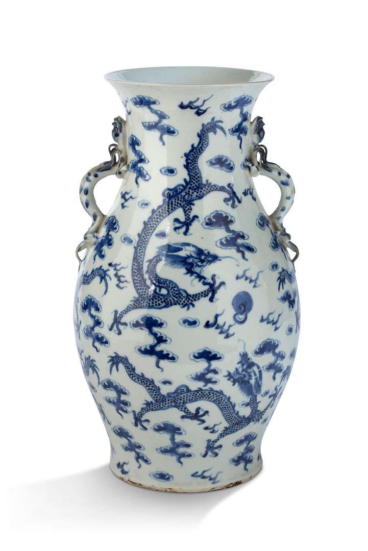 Vase en porcelaine bleu-blanc à décor de dragons parmi les nuées, le col flanqué de deux anses en forme de chilong. La base avec une marque Guangxu à quatre caractères en bleu sous couverte.