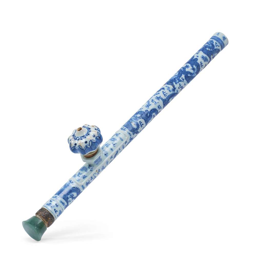 Pipe à opium en porcelaine bleu-blanc décorée de dragons pourchassant la perle parmi les nuées. Un embout en pierre dure verte avec une bague en métal argenté à décor de caractères Shou stylisés, l'autre embout portant une marque Kangxi à six caractères en bleu sous couverte.