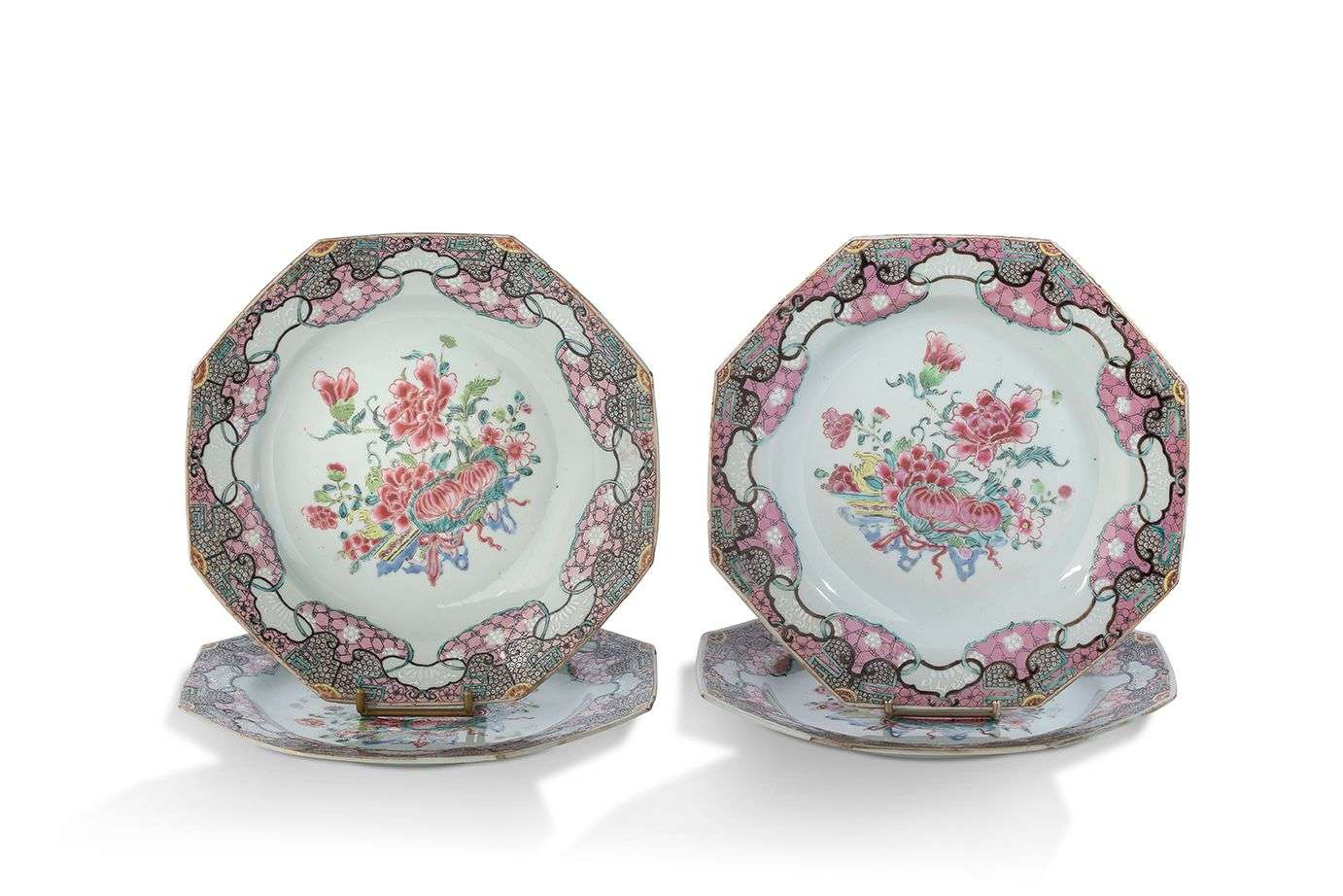 Quatre assiettes octogonales en porcelaine de la famille rose décorées au centre de paniers fleuris, l'aile avec une large frise ornée de motifs de têtes de ruyi et glace brisée.